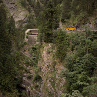 Der moderne Transitverkehr durchquert die einstmals gefährliche Schluchtenlandschaft auf der Autostrasse A13 in wenigen Minuten. Wir nehmen uns Zeit, die Passage auf der kühn angelegten historischen Kunststrasse zu bereisen, und entdecken die Region im Panoramablick des Oldtimer-Postautos aus anderer Perspektive.